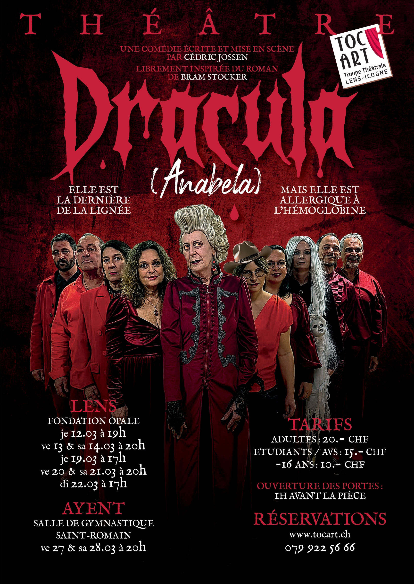 Anabela Dracula Elisabeth Kuonen La Femme Fantôme Stéphanie Wirth Mina Murray Mégane Delacombaz Lucy Westenra Elisabeth Cordonier Arthurine Holmwood Viviane Lamon Quincey Morris Carole Zufferey Professeur Abraham Van Helsing Philippe Arlettaz Dr John Seward Samuel Bless Jonathan Harker Lionel Bourgeois Robert Montague Renfield Cédric Jossen