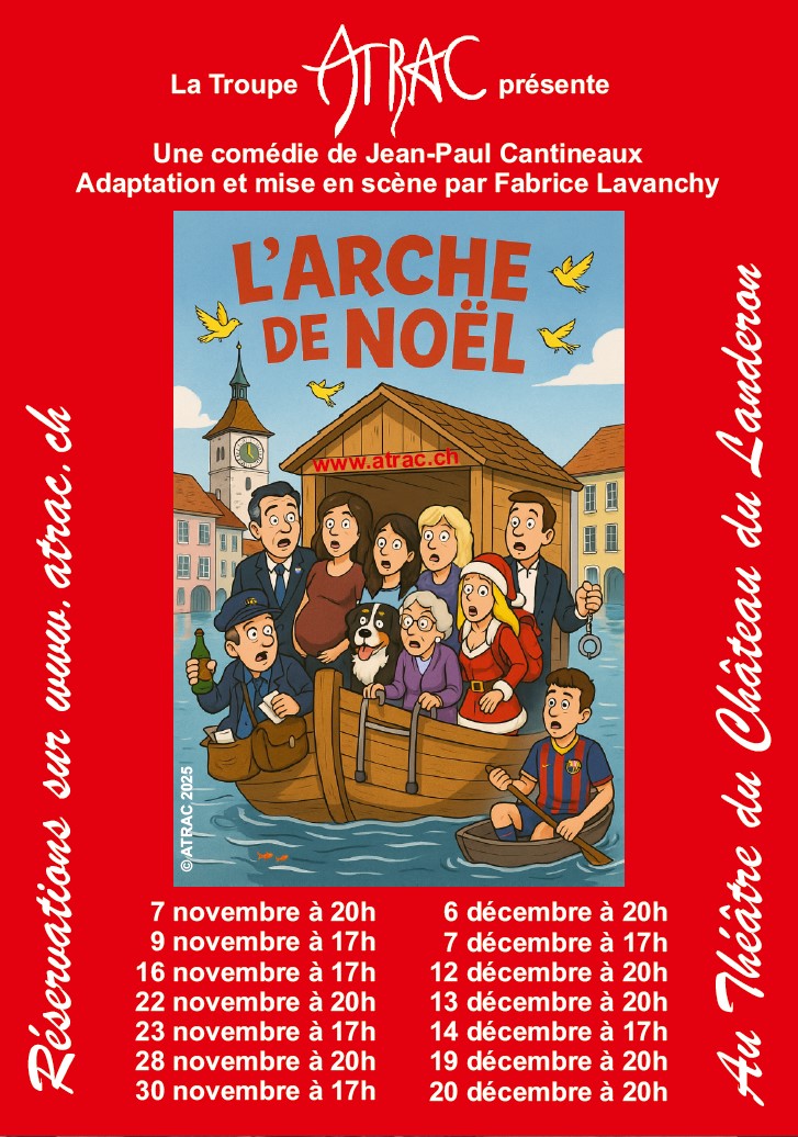 ![]() La Troupe ATRAC continue sa saison 2025 et vous propose “L’ARCHE DE NOËL” une comédie “Archi-comique” de Jean-Paul Cantineaux, adaptation et mise en scène par Fabrice Lavanchy, du 7 novembre au 20 décembre 2025. Lors des deux premières représentations, le 7 et 9 novembre, tous les billets sont à CHF 10.-. www.atrac.ch Résumé : Le […]