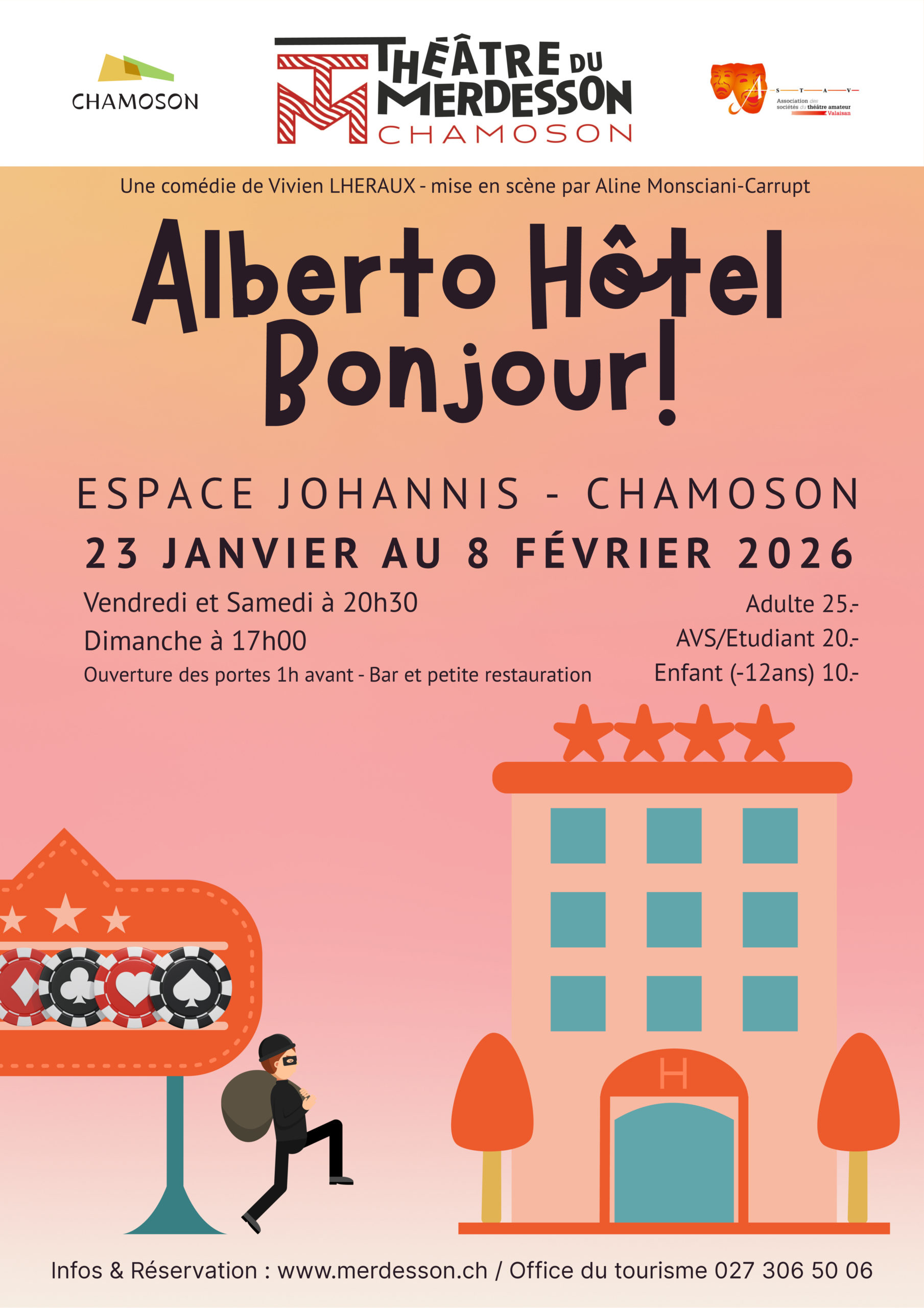 Espace Johannis de Chamoson Rue Plane-Ville 24, Chamoson, ValaisUne comédie de Vivien Lheraux et mise en scène par Aline Monsciani-Carrupt. "Suzanne, la directrice de l'Alberto Hôtel est à deux doigts de craquer et franchement, il y a de quoi ! Entre les va-et-vient du personnel qui n'est vraiment pas à la hauteur, l'arrivée de clients hauts en couleur et le cambriolage du casino […]